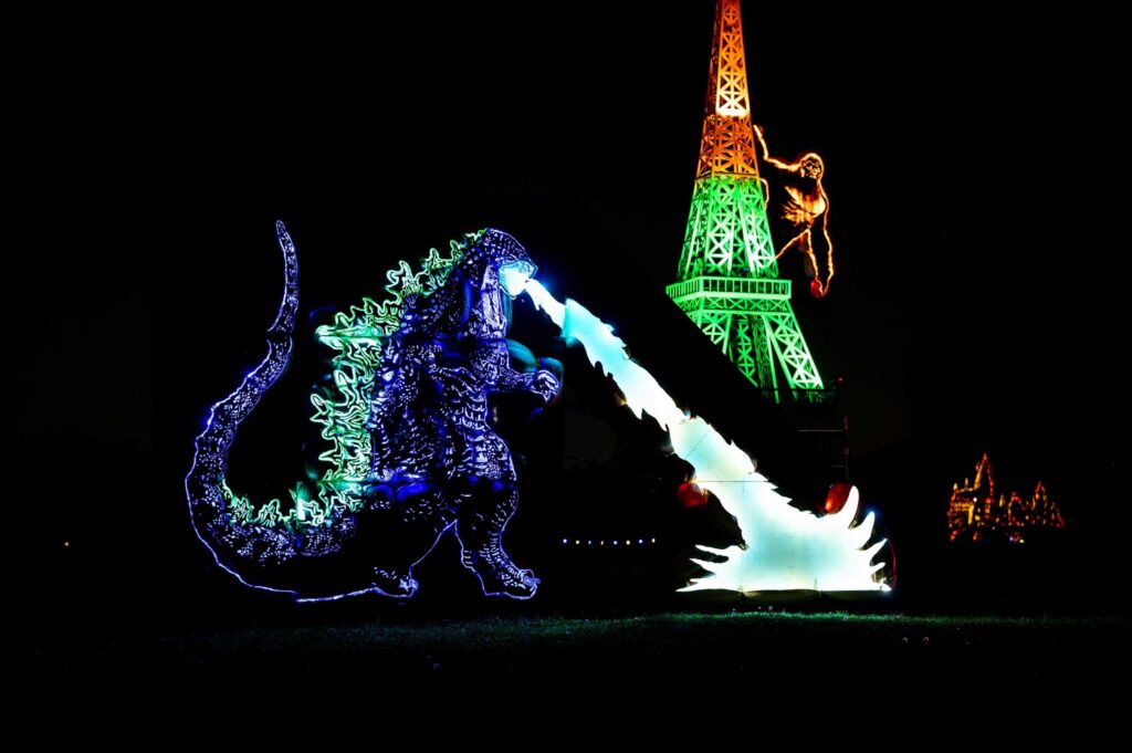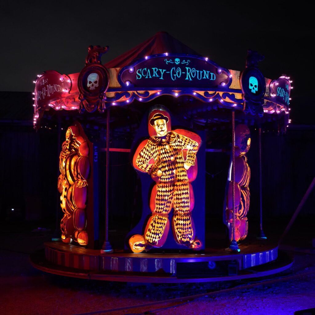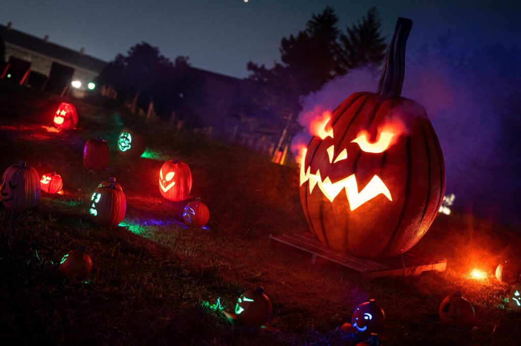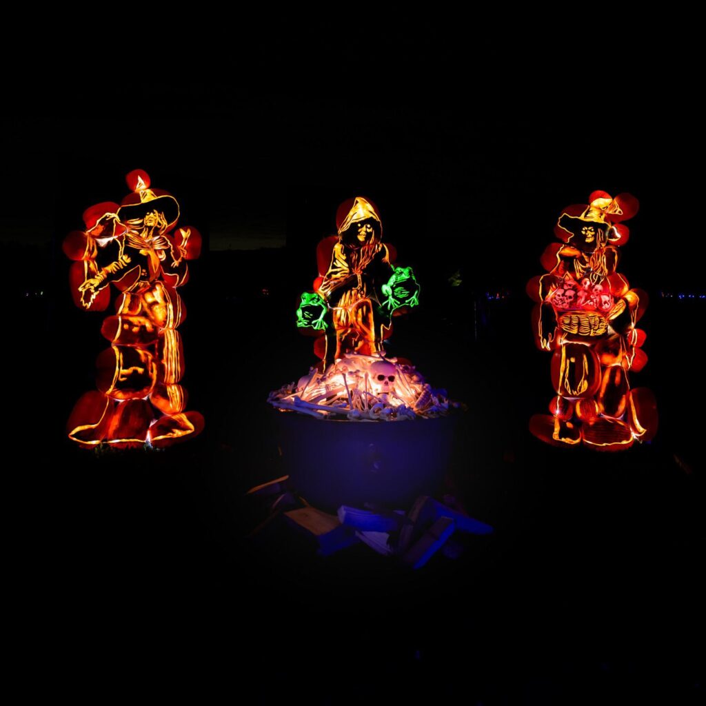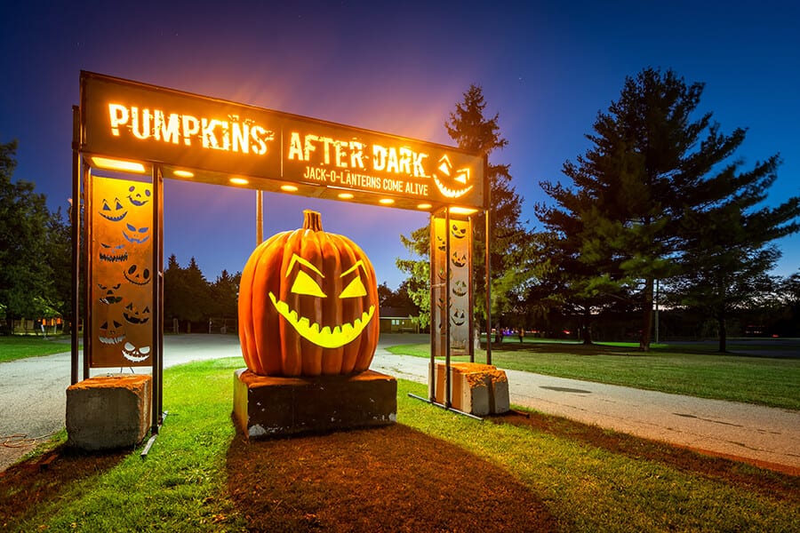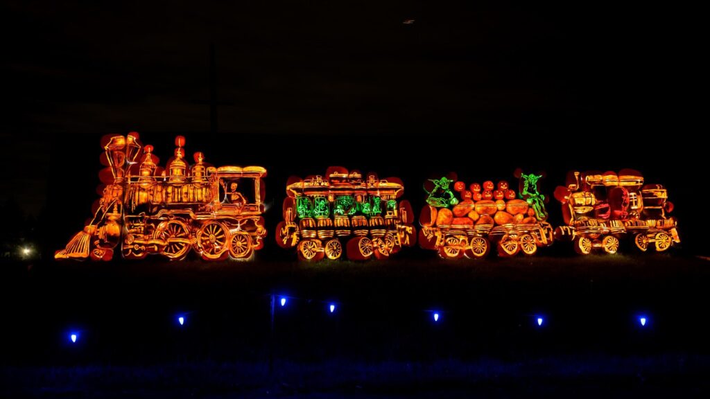 Pumpkins After Dark is a walking “trail” full of illuminated pumpkin sculptures and creative displays — no jump scares, just glowing magic.