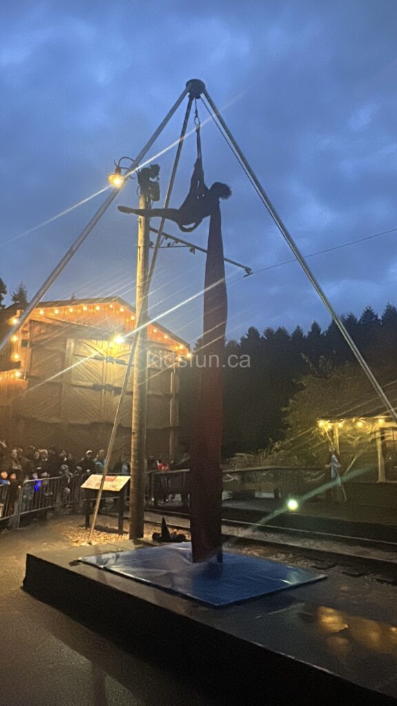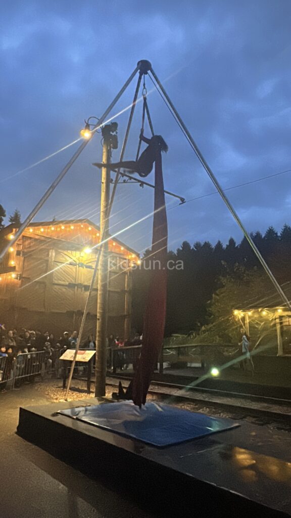 • A thrilling performance by the Vancouver Circus School. Unlike your typical “creepy vs. comical” show, their aerialist is exceptionally skilled — one lady climbed up two long length of cloth, ascended high into the air … then dropped down halfway to surprise (and nicely startle) the audience. We were relieved to see her safe and sound afterwards — but what a moment!